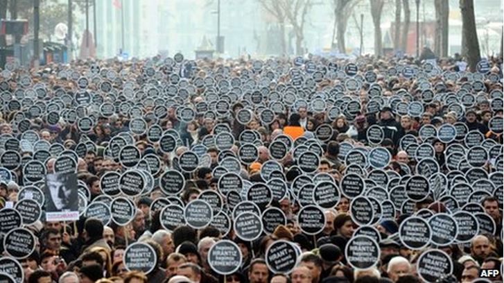 “In my country the most important name of this resisting force is Hrant Dink. Because Hrant Dink, with his stand, kept on reminding them of their past full of crimes, the past which they desperately tried to make people forget. Because Hrant Dink not only kept reminding them of the truth about the past, but everyone that he touched with his words—his readers, his listeners, his followers, people in the street—everyone believed him. They murdered Hrant Dink, because he stood right where the state had drawn the red lines, the taboos that it feared. Hrant Dink became the only visible target for the historical hatred against Armenians, and he stood in the crosshairs of both opposition and government forces.…