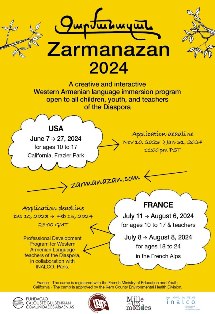The Armenian Communities Department of the Calouste Gulbenkian Foundation is happy to announce that Zarmanazan, the Western Armenian language immersion program, will expand in 2024. It will take place both in France and in the United States!