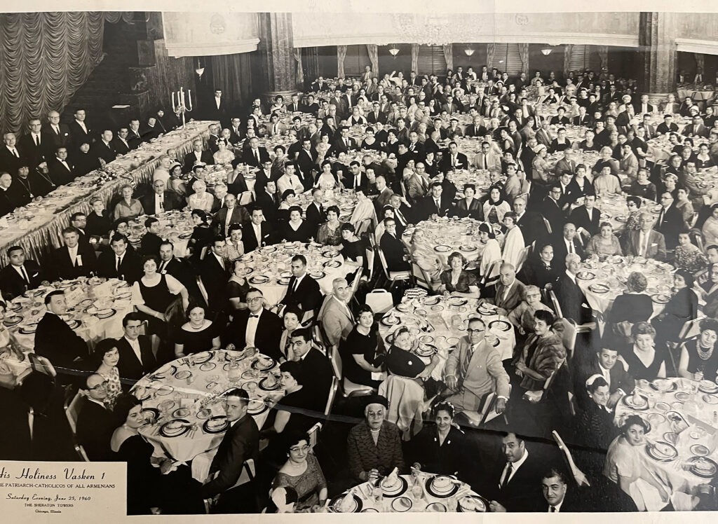 I was recently at St. Gregory the Illuminator Church in Chicago for a concert. I noticed a photo, black and white, taken at a banquet at the Sheraton Towers on June 25, 1960, in honor of the visit of Catholicos Vazken I, of blessed memory. The photo was taken from a balcony and showed the head table and at least 30 tables of 10 people that could fit in the shot. Everyone was dressed up—to the nines as they used to say. My guess is there were 350-500 people in attendance.