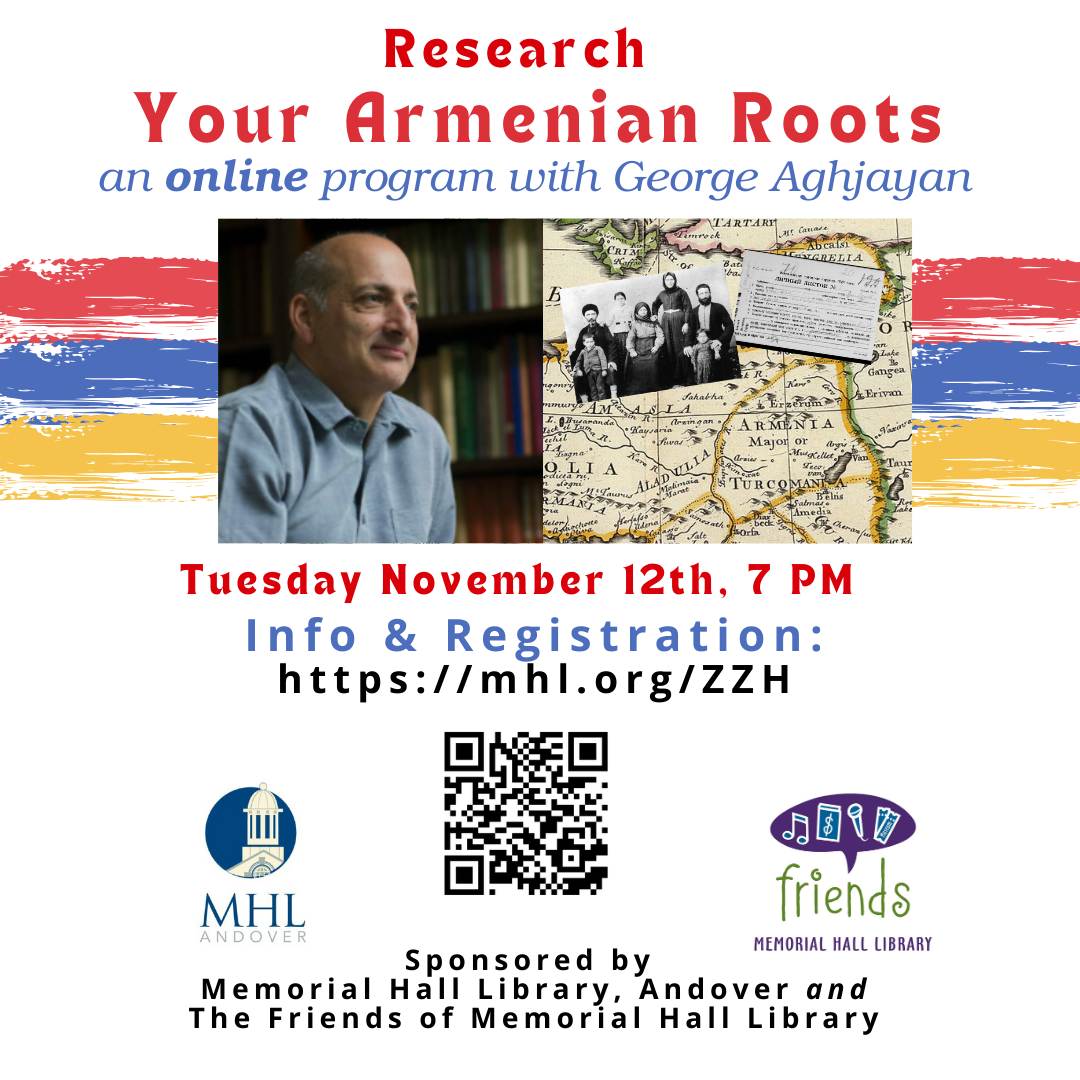 George Aghjayan will be offering an online program titled “Researching Your Armenian Roots,” sponsored by the Memorial Hall Library in Andover, Massachusetts, on Tuesday, November 12, 2024 from 7:00-8:00 p.m. Register online for the presentation.