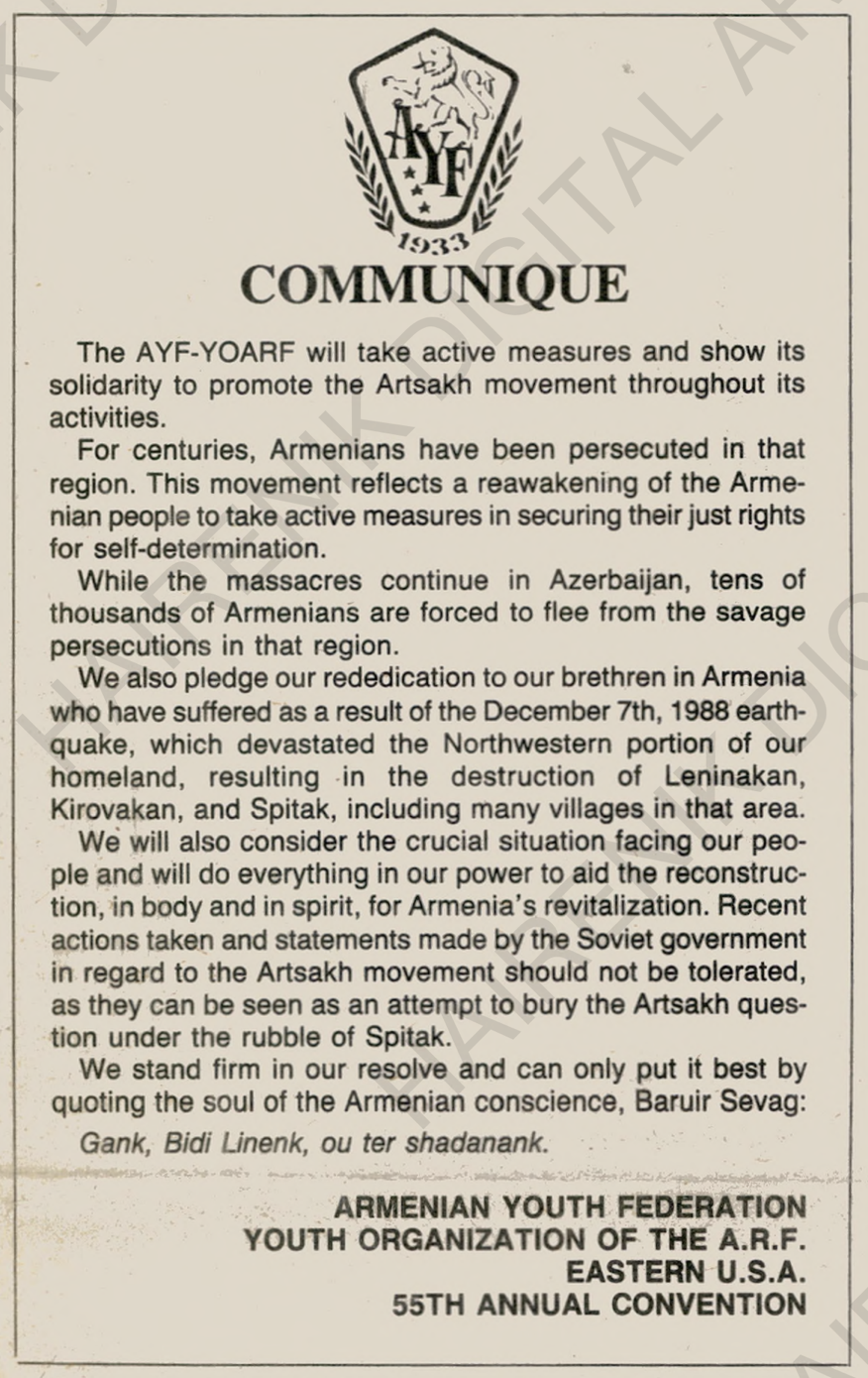 Home/Documenting AYF history in the Hairenik and Armenian Weekly/#24 earthquake and artsakh communique #24 earthquake and artsakh communique