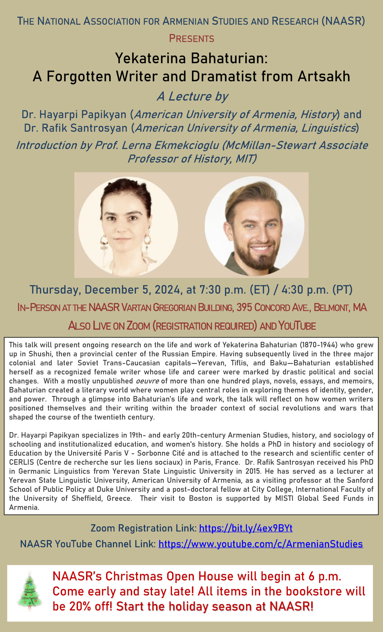Dr. Hayarpi Papikyan and Dr. Rafik Santrosyan, both of the American University of Armenia, will be the featured speakers during the NAASR holiday open house on Thursday, December 5, 2024, at the NAASR Vartan Gregorian Building, 395 Concord Ave., Belmont, Massachusetts.