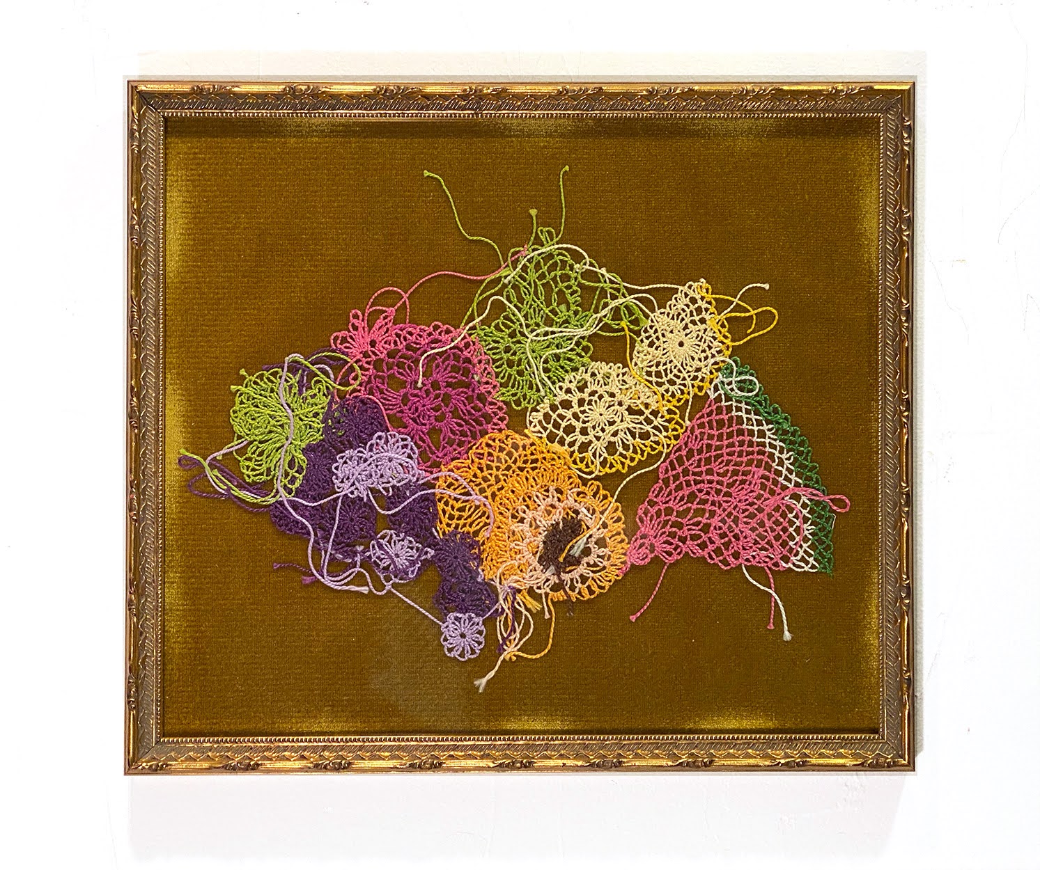 Though Emma often uses traditional patterns in her works, she also tries to implement non-traditional colors or applications. In fact, she often finds herself referring to symbols including fruit, mountains and suns, and even uses the lace to spell words, or create a still life. Currently, she is making a series of janyaks using reclaimed fishing line, acknowledging its historical roots in fishing net-making.