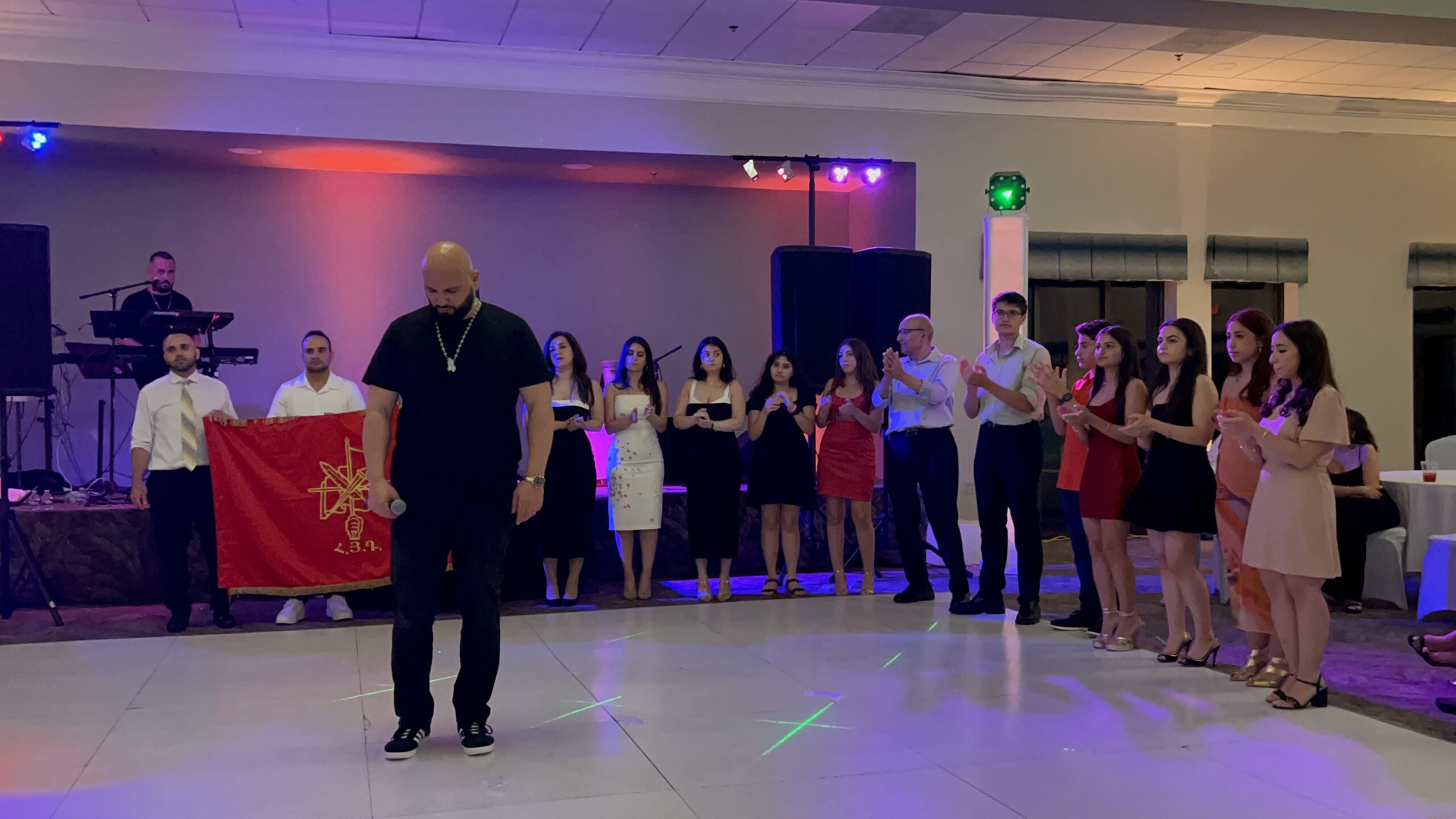 As the evening drew to a close, Berberyan shifted to a more solemn tone, leading the audience into a stirring tribute to Armenian history and identity. Before performing Kini Litz, he recounted the story of Soghomon Tehlirian, evoking a powerful moment of collective remembrance. Local Armenian youth stood arm in arm behind him, holding the ARF flag, as the entire room joined in a medley of heghapokhagan (revolutionary) songs.