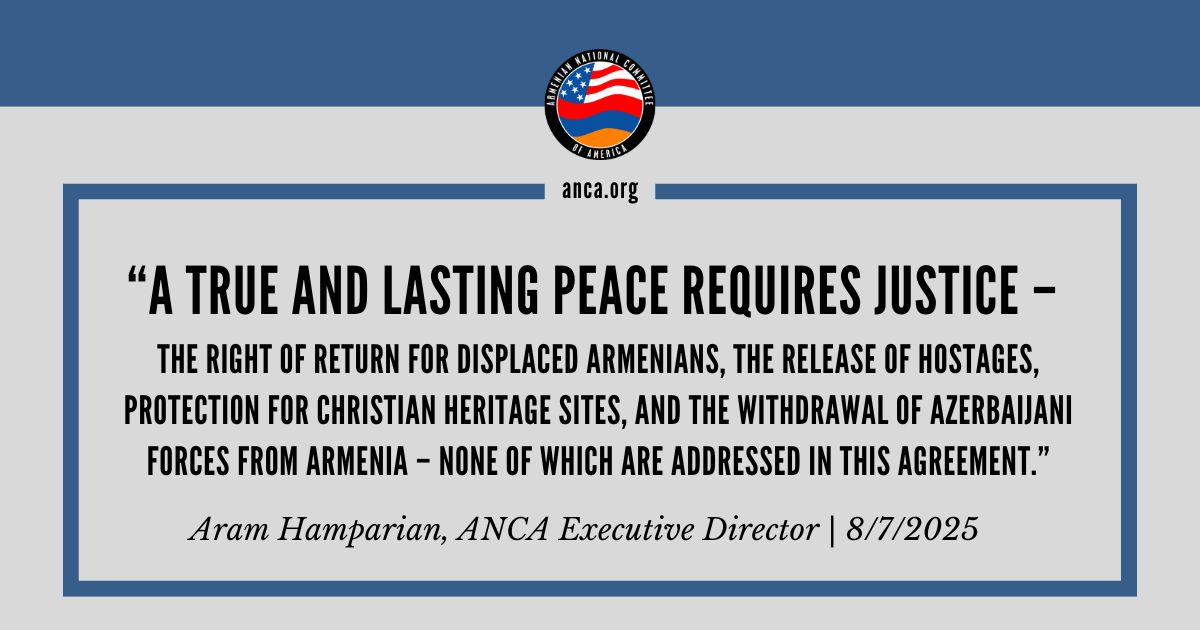“The same Donald Trump who failed to stop Azerbaijan’s 2020 attack on Nagorno Karabakh is now rewarding this aggression, compromising Armenia’s sovereignty and consolidating Azerbaijan’s genocidal ethnic cleansing of over 150,000 indigenous Armenian Christians,” stated ANCA Executive Director Aram Hamparian. “A true and lasting peace requires justice—the right of return for displaced Armenians, the release of hostages, protection for Christian heritage sites and the withdrawal of Azerbaijani forces from Armenia – none of which are addressed in this agreement.”