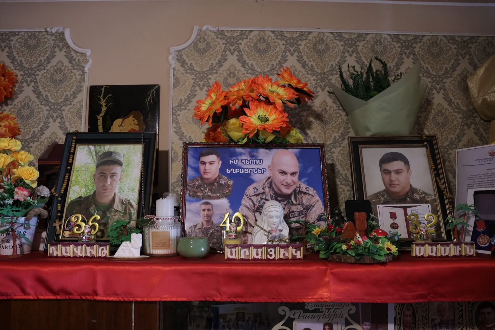 In the living room of Bella Galstyan’s rented apartment, a photograph of her three brothers in military uniforms hangs on the wall. Beneath it, in a corner dedicated to their memory, are family photos and personal belongings from when they were all together.
