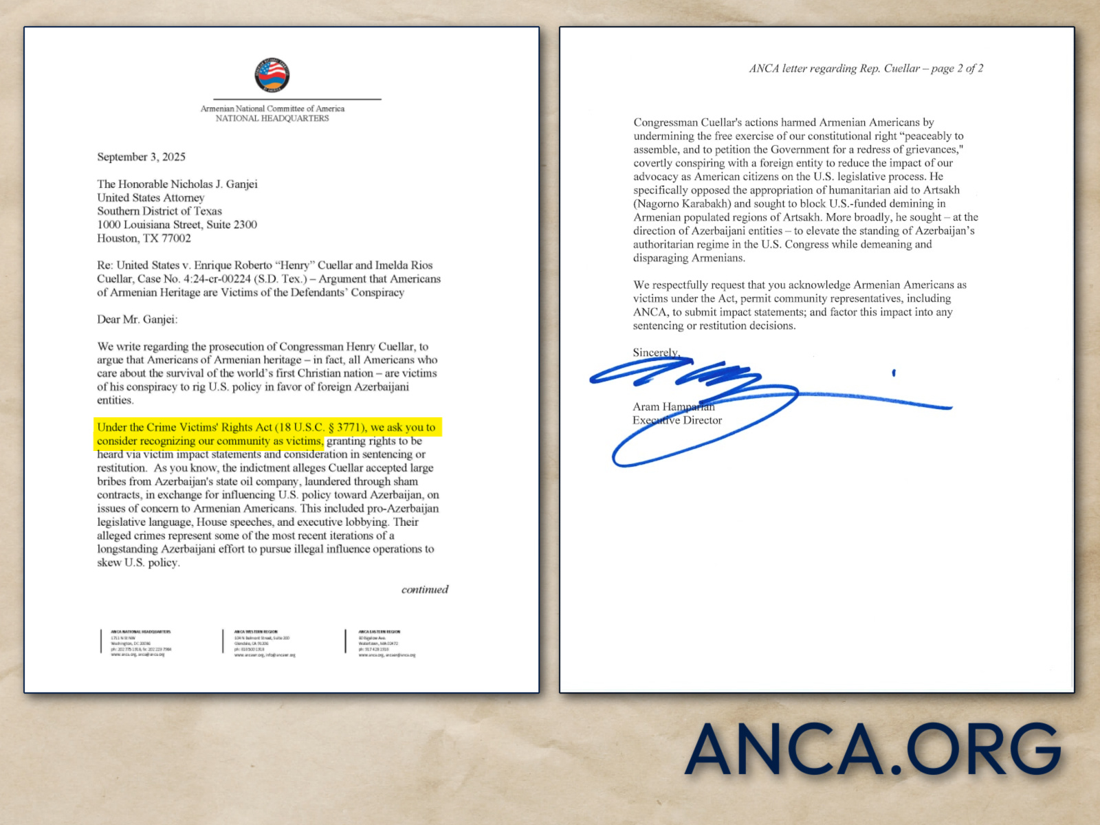 WASHINGTON— The Armenian National Committee of America (ANCA) has formally called upon U.S. Attorney Nicholas J. Ganjei to recognize Americans of Armenian heritage as victims of Congressman Henry Cuellar’s (D-TX) criminal conspiracy with Azerbaijan — under the Crime Victims’ Rights Act (18 U.S.C. § 3771). This designation would permit Armenian American community representatives, including the ANCA, to submit victim impact statements and ensure the harms they suffered are factored into any sentencing or restitution decisions in the case.