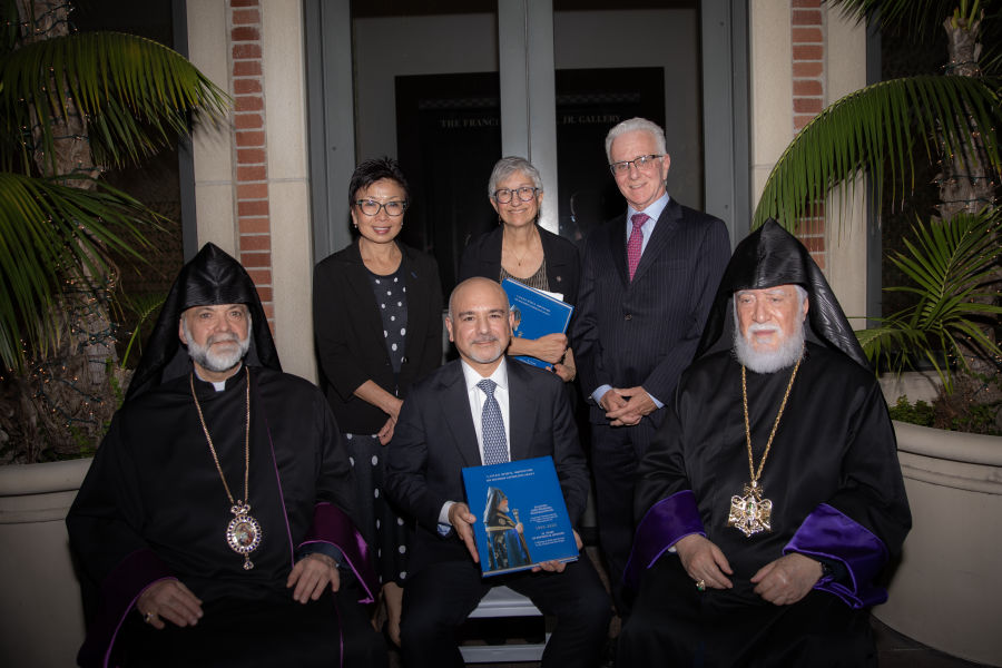 His Holiness was joined by Archbishop Kegham Khatcherian, Prelate of the Western Prelacy of the United States, and other members of the Western Prelacy of the Armenian Apostolic Church. The program was opened by Professor Ann Karagozian, director of the Promise Armenian Institute, followed by welcoming remarks from Vice Provost Cindy Fan, and introductions by His Eminence Archbishop Khatcherian. Both Provost Fan and Professor Karagozian remarked that this was His Holiness’ second visit to UCLA; the first was coordinated by the late Professor Richard Hovannisian in 2011.