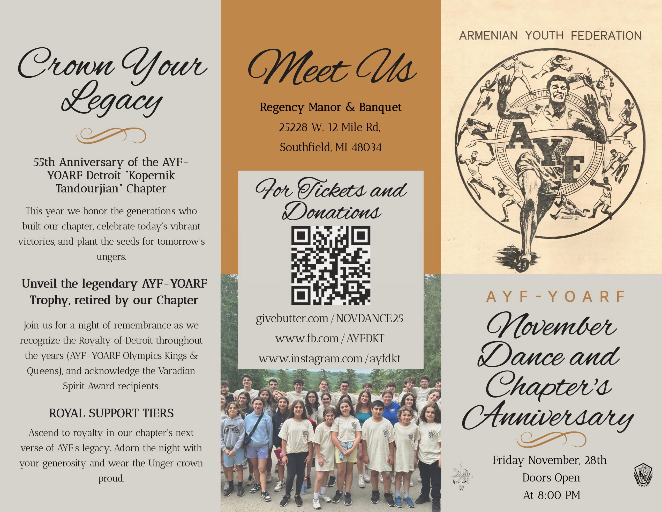 The Armenian Youth Federation-Youth Organization of the Armenian Revolutionary Federation (AYF-YOARF) Detroit “Kopernik Tandourjian” Chapter will mark its 55th anniversary during the annual November Dance on Friday, Nov. 28, 2025, starting at 8:00 p.m. EST. The event, held at the Regency Manor and Banquet Center (25228 W. 12 Mile Rd., Southfield, Mich. 48034), promises a night of celebration, remembrance and community spirit, honoring the chapter’s legacy while looking toward the future.