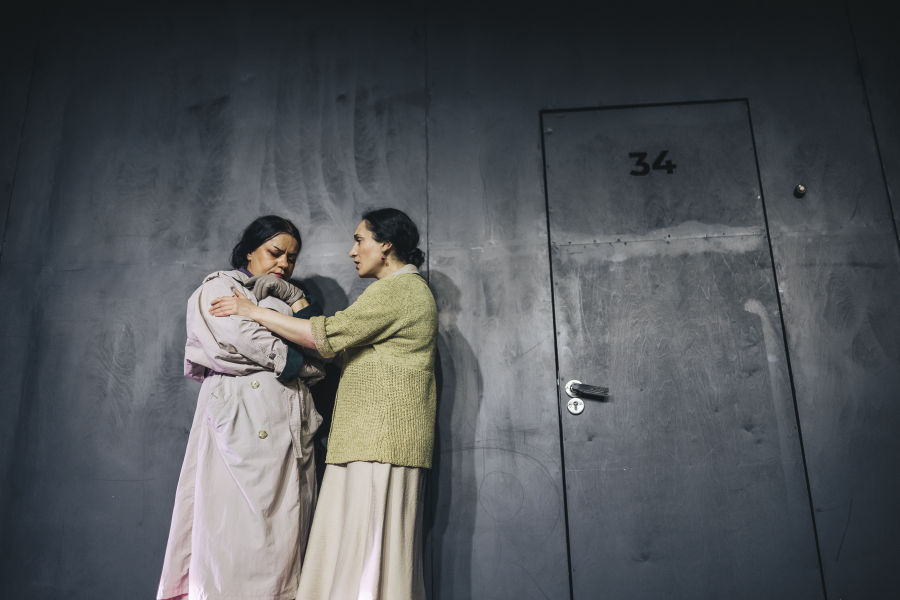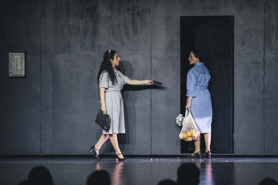 Characters parade before door 34 — some are colleagues, some are neighbors. They come to accuse, to provoke, to beg. Their insults are veiled as concern. What they all have in common is a desperate demand: for the woman behind the door to stop being different. But the door remains closed. There’s only one physical link to the woman inside: her mother. She haunts the door with groceries, muttering words of concern or disapproval as she watches others attack her daughter.