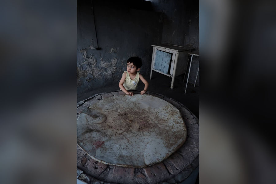 While waiting, she noticed a boy of about 9 holding grapes. His running added motion to the stillness of the convoy. She followed him with her camera. Where is he taking them? she wondered. The boy reached the platform of a truck, stood on tiptoe and lifted the grapes up. A dried hand reached out, took them and disappeared. She pressed the shutter.