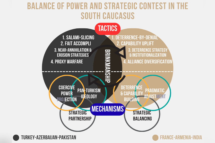 This article applies Stephen M. Walt’s balance-of-threat framework and Thomas Schelling’s theories of deterrence and compellence to analyze Armenia’s strategic choices. Rather than framing Armenia’s realignment as a mere post-war reaction, the article situates it within a broader reconfiguration of Eurasia’s security architecture. The central hypothesis advanced is that Armenia’s turn toward France and India is driven not by opportunism or cultural affinity, but by structural geopolitical processes: the consolidation of a Pakistan–Azerbaijan–Turkey axis, which incentivizes India to project influence westward, and Russia’s partial withdrawal from the South Caucasus, which enables France — aspiring to assert European leadership — to expand its presence. Armenia’s partnerships thus seek to leverage great- and middle-power rivalries to recalibrate the regional balance of power and secure a more advantageous strategic position.