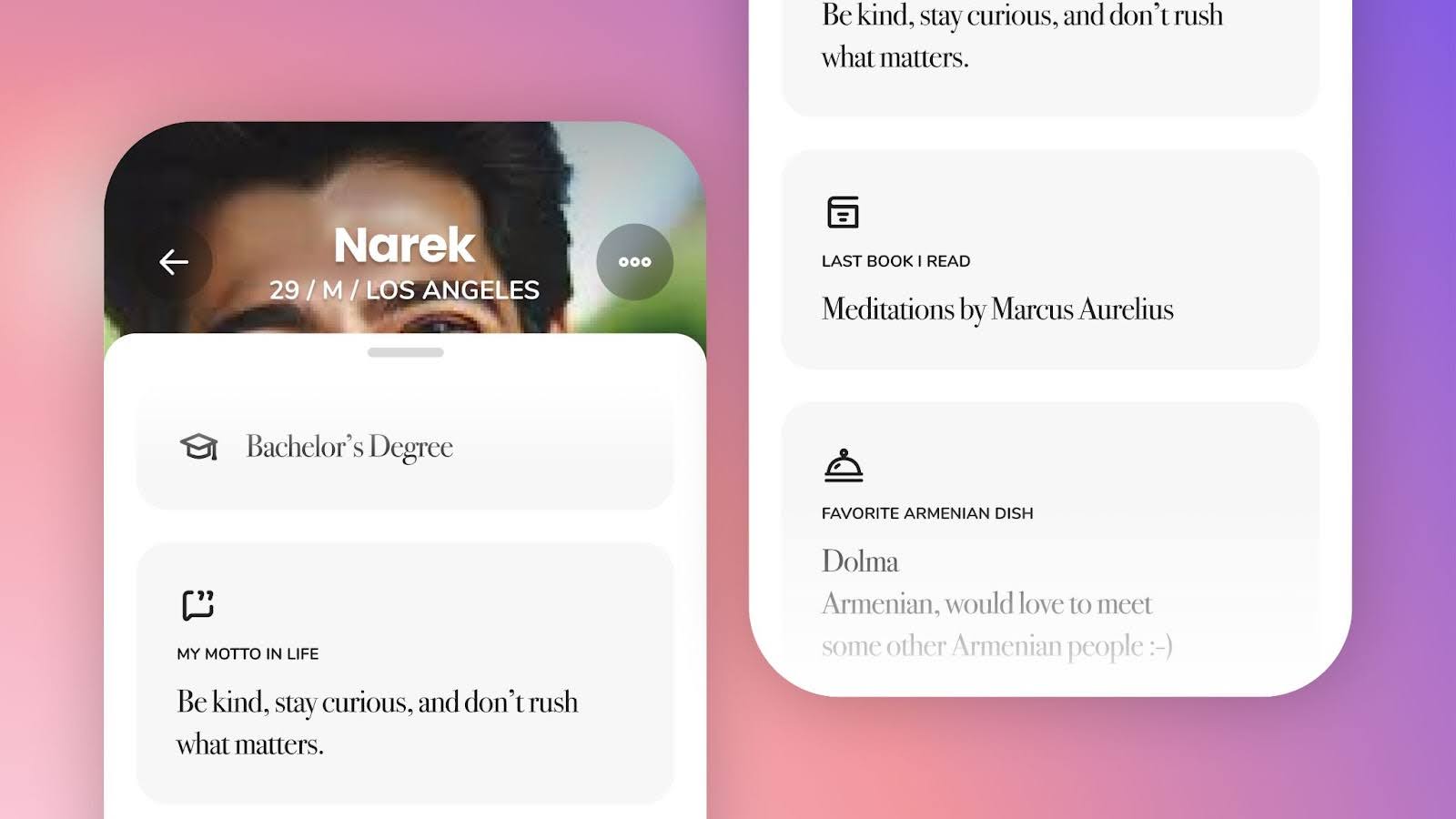 Profiles go beyond photos and include things like education, books I’ve read recently, favorite Armenian dishes, my personal motto — these appear in the form of profile prompts. The goal is to give people enough context to start a conversation, not small talk. It’s not about quick reactions; it’s about gauging the swiping and giving people more context to connect on a deeper level.