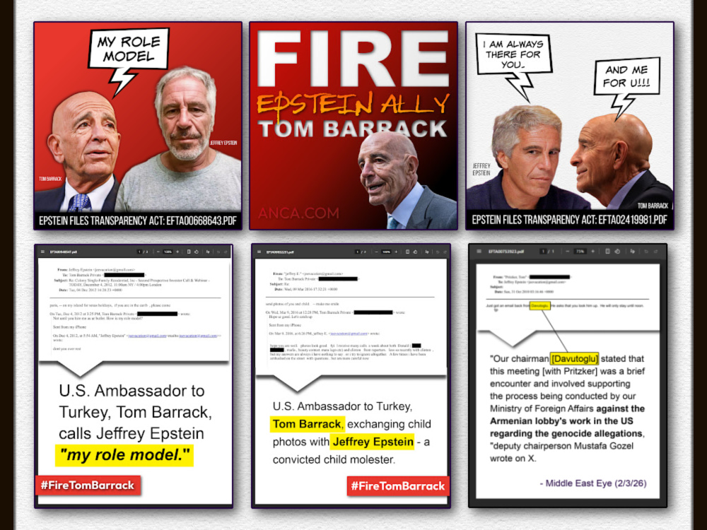“Tom Barrack called a convicted child sex trafficker his ‘role model’ — in writing,” said ANCA executive director Aram Hamparian. “He appears over 540 times in the Epstein files. And before all of this came to light, he was already on record denying the Armenian Genocide on behalf of the Turkish government. President Trump needs to fire him now.”